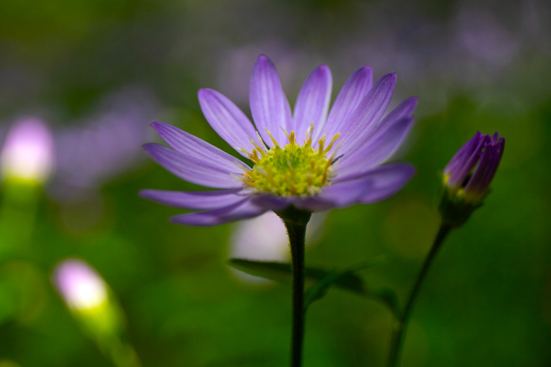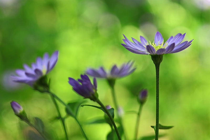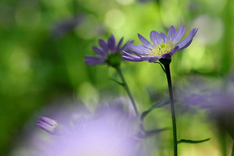 ミヤコワスレは、ミヤマヨメナを原種とするキク科の多年草で、江戸時代から栽培され、紫・桃・白の花を咲かせる。特に紫が好まれ、切り花として流通するのは紫のみ。種子には稔性がなく、株分けで繁殖する。鎌倉時代、承久の乱で佐渡へ流された順徳天皇がこの花を見て都恋しさを忘れたという伝承があり、花言葉は「別れ」「しばしの憩い」。開花は5〜6月で、静岡県西遠地方では切り花栽培が盛ん。野菊に似た優しい風情があり、茶花としても親しまれる。